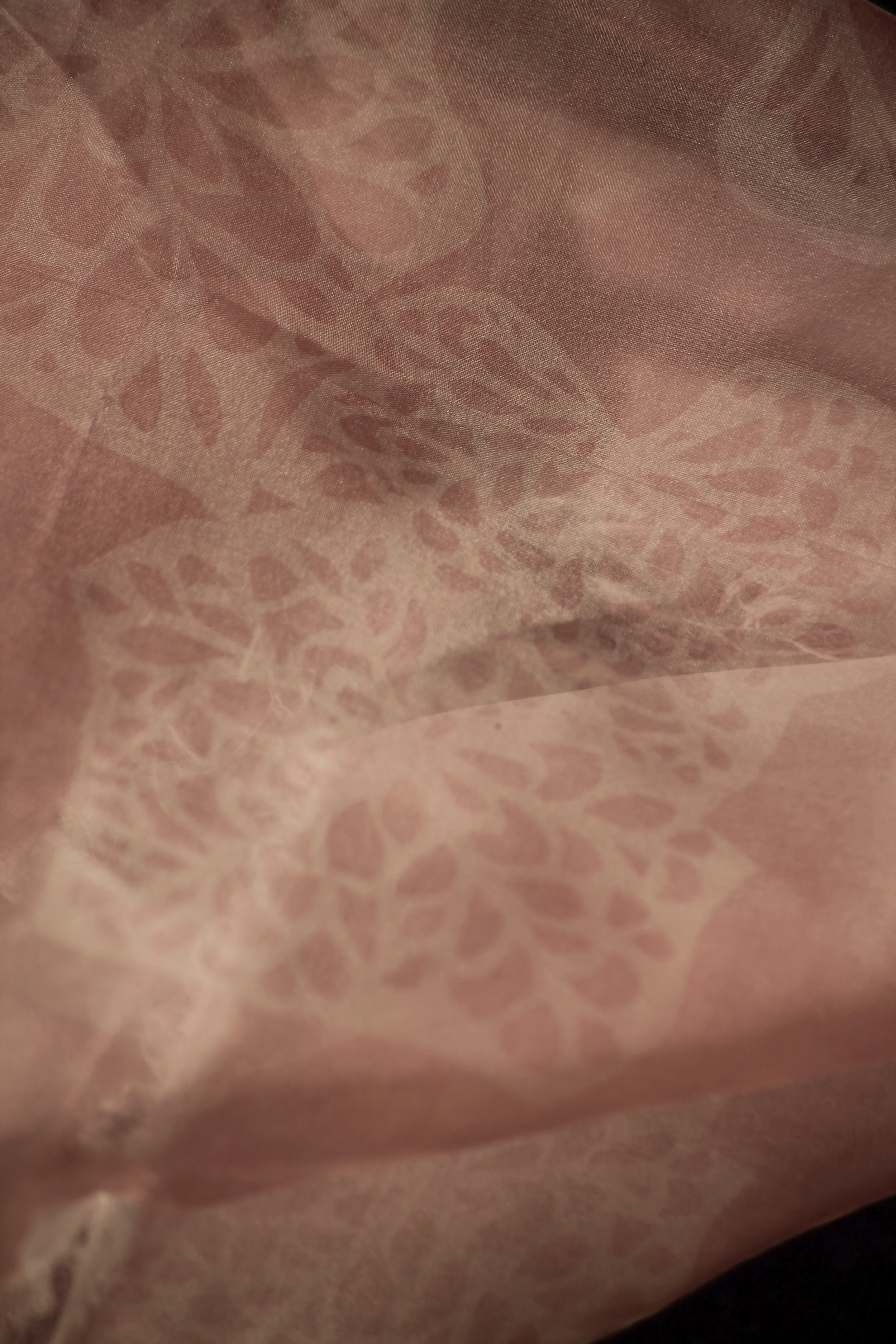 The combination of these materials are explored through uses of knit, stitch and dyeing. The knitting features silk with inlaying of banana fibre and a delicate assortment of found natural materials. Stitched work is done upon silk organza, cotton organdie and pineapple and banana fibre using traditional stitch techniques to pattern the fabrics.